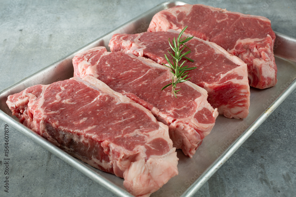 A view of a four choice New York steaks, on a baking sheet.