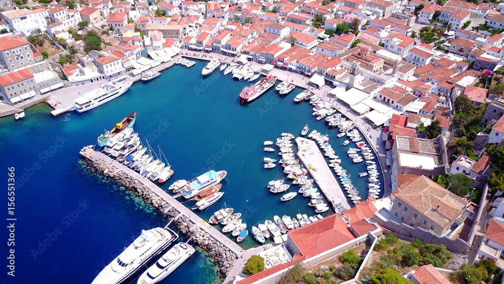 Aerial drone video of Hydra picturesque island, Saronic gulf, Greece