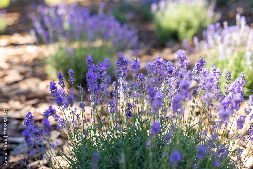 Purple lavender bushes grow in a flowerbed, decorated with covered bark, tree bark in the garden on a sunny summer day.