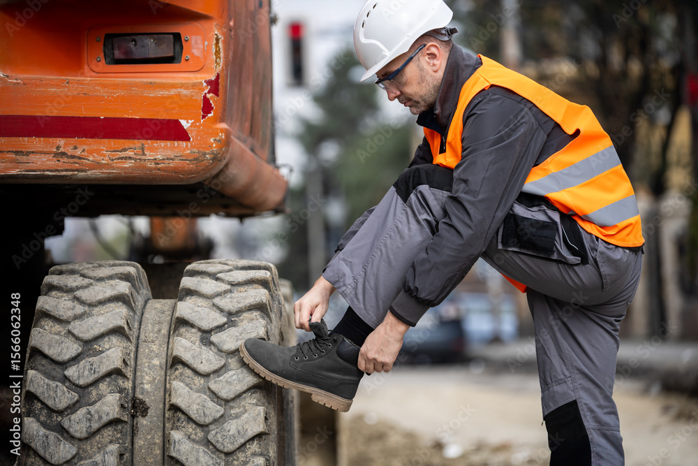 Construction worker adjusts boots before operating heavy machinery at a worksite in the city