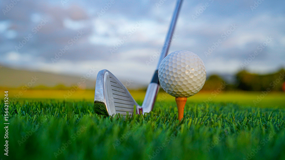 Golf clubs and balls on a green lawn in a beautiful golf course with morning sunshine.