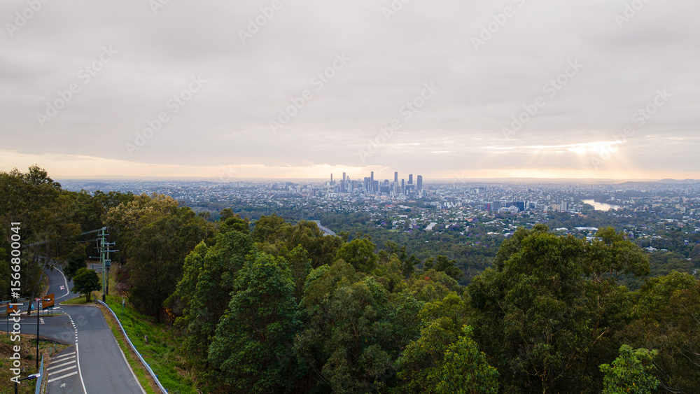 Brisbane skyline emerging from lush forest at sunrise under cloudy sky