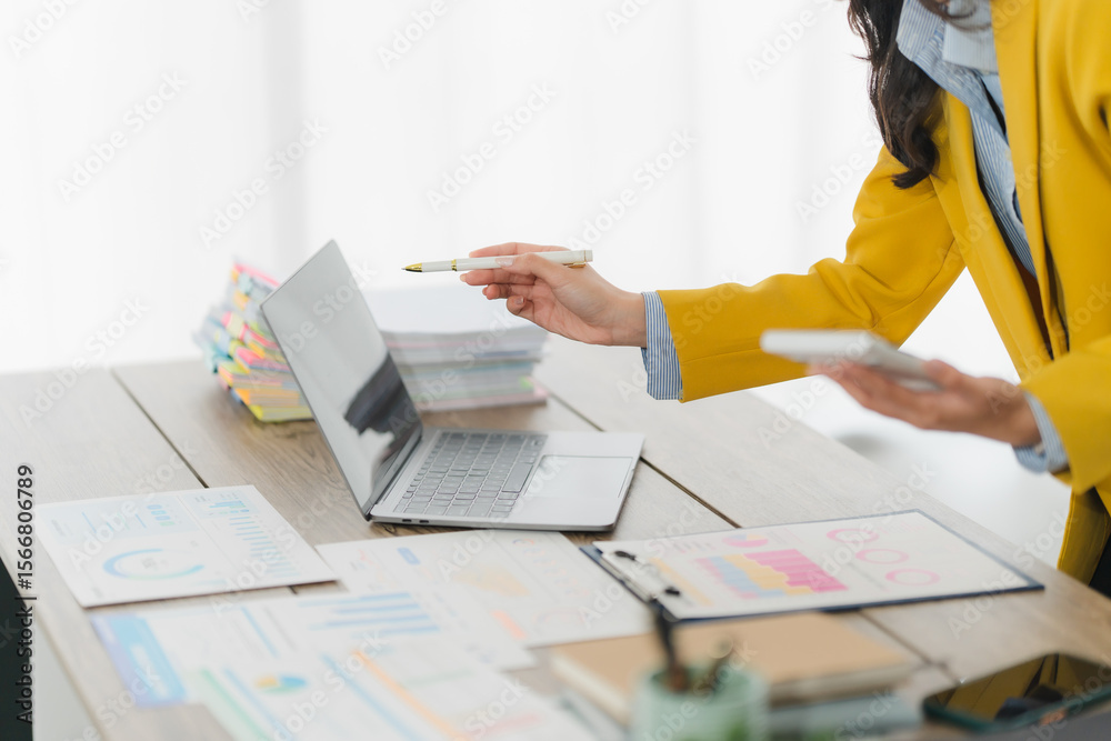 Focused Professional: A focused individual working in an office setting, engrossed in a laptop, papers and smart phone with bright natural lighting and office setup.
