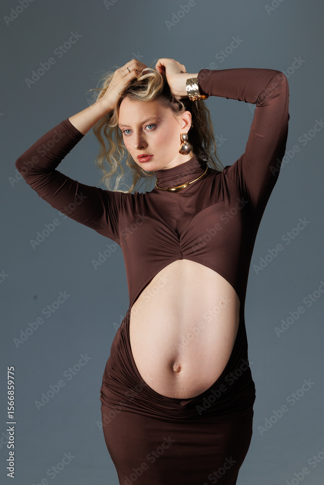 Beautiful pregnant young blonde in a brown dress with an open belly stands against a white wall. Pregnant girl sits on a red chair. Art smudges portraits. Woman awaiting child. Fashion
