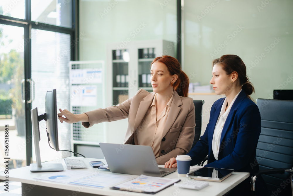 Asian business colleague business presents and explains and using laptop and tablet. Teamwork