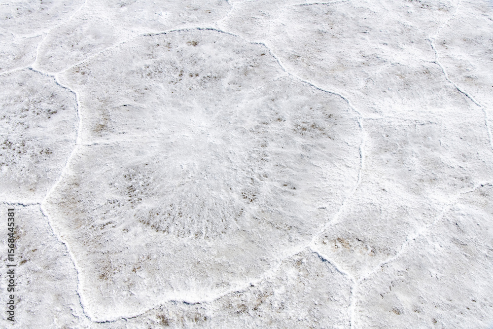 Close up of hexagon patterns in salt pan of the Bonneville Salt Flats a remnant of the Pleistocene Lake Bonneville near Wendover, UT, USA
