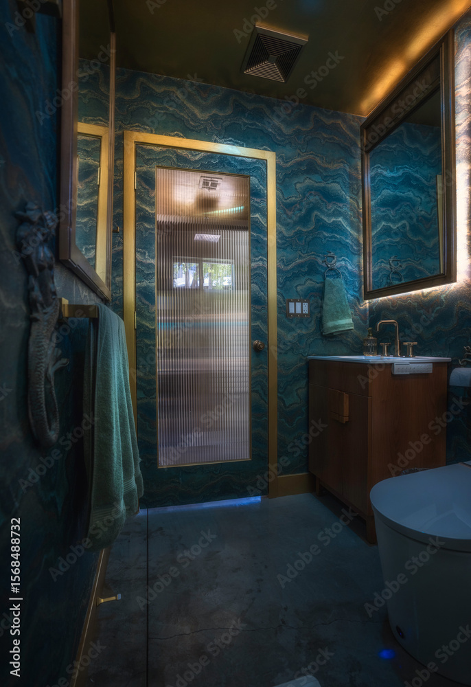 Moody ocean-themed bathroom with custom wave wallpaper, gold trim, and dramatic lighting—featuring a cinematic view of the door framed in opulent detail and aquatic-inspired texture.