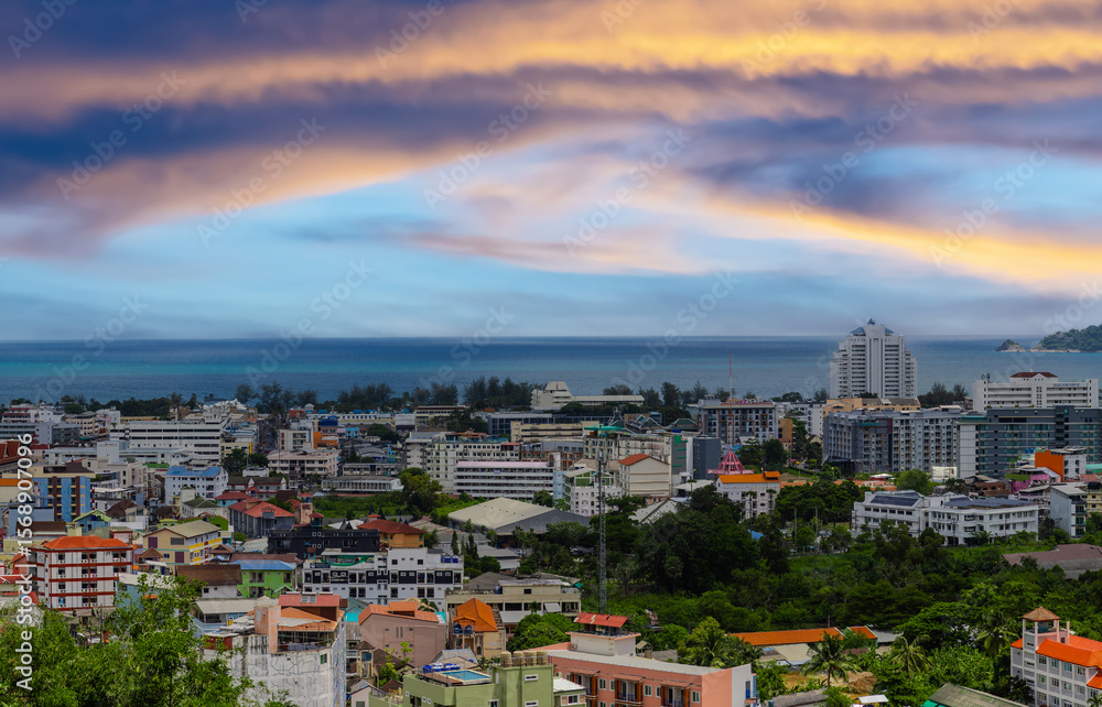 view of Patong and Patong Beach from the mountains colourful skies at Sunset. Patong is a vibrant city full of tourists from all around the world.