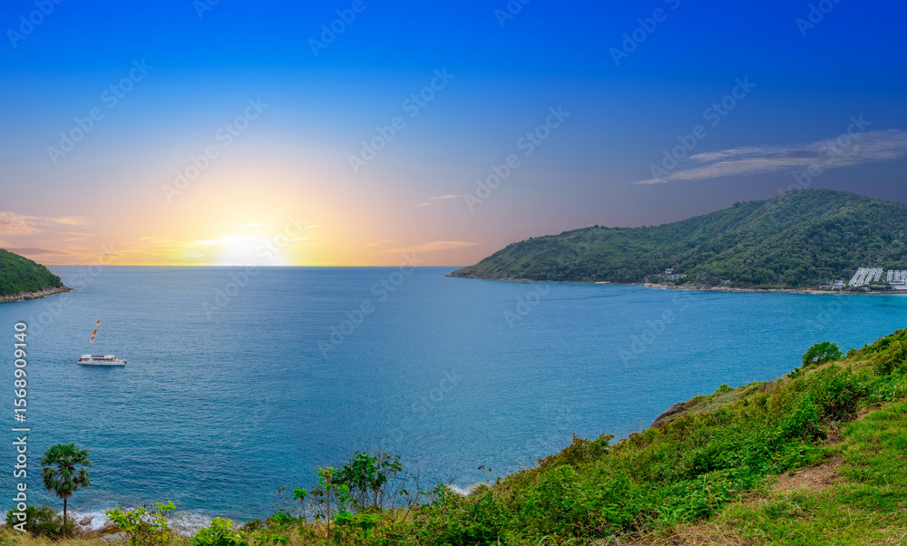 view of Patong and Patong Beach from the mountains colourful skies at Sunset. Patong is a vibrant city full of tourists from all around the world.
