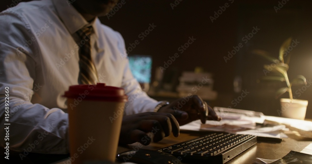 A businessman uses a computer while sitting at his desk in a dark office. Close-up of his hands, unrecognizable persona