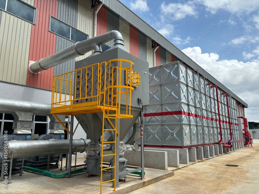 Industrial dust collector system and blower fans installed outside factory for air filtration and ventilation efficiency