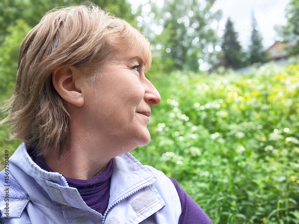Mature blonde woman enjoying nature during a travel excursion on a summer day