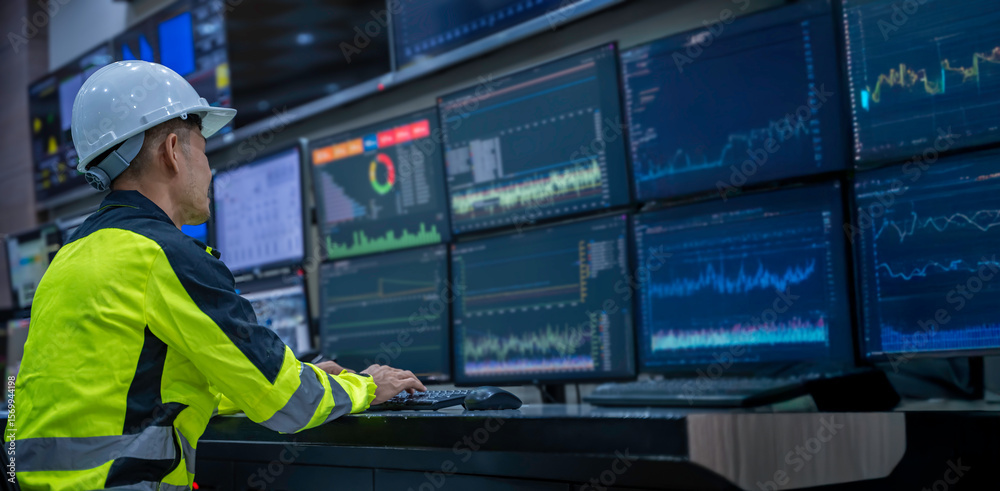 Engineer working at control room, Manager control system, Technician man monitoring program from a lot of monitor.