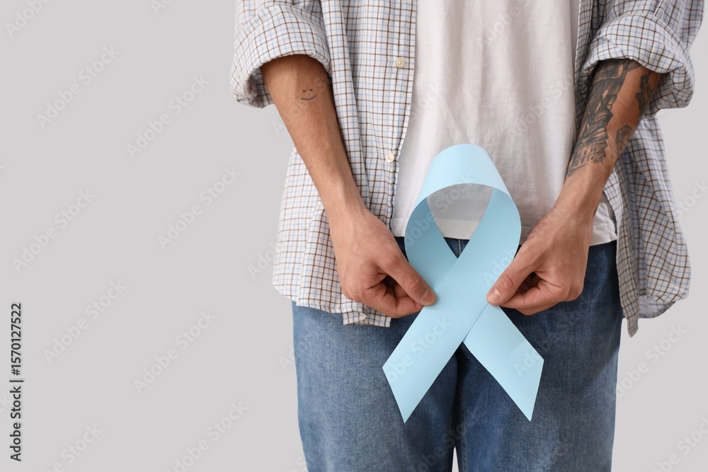 Young man with blue ribbon on light background, closeup. Prostate cancer awareness concept