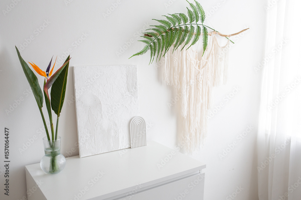 Stylish spring or summer home interior decor. Vase with a strelitzia flower, macrame wall hanging decoration, fern leaf. Composition on the dresser. Light modern room.