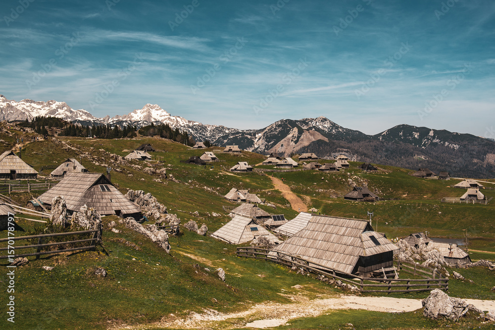 Mountain village in Alps, wooden houses in traditional style, Velika Planina, Kamnik, Slovenia