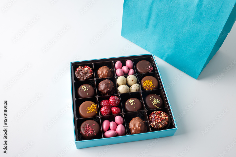 assorted chocolate candy box with colorful toppings and texture in blue package with matching bag for birthday father day or holiday gift product photo for candy brand bakery or e commerce showcase,