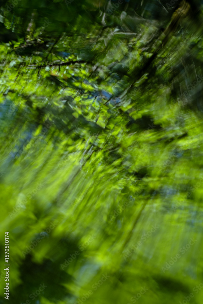 Sunlight streams through vibrant leaves, creating playful shadows on a calm water surface