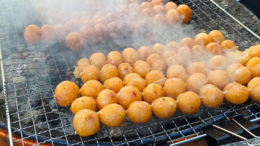Dozens of small sausage balls are skewered and grilled over a smoky charcoal fire, typical of Southeast Asian street food