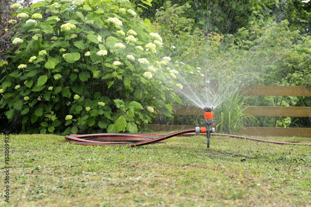 A garden hose with sprinkler is spraying water next to a yellow wooden hedge in a summer garden on the background of shrubs and garden plants.