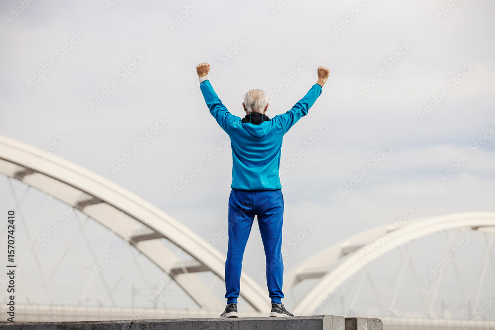 Rear view of senior sportsman standing on riverbank and celebrating achievement and victory.