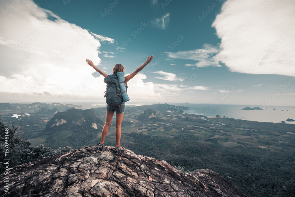 Hiker stands on top of a mountain with raised hands and enjoys valley view