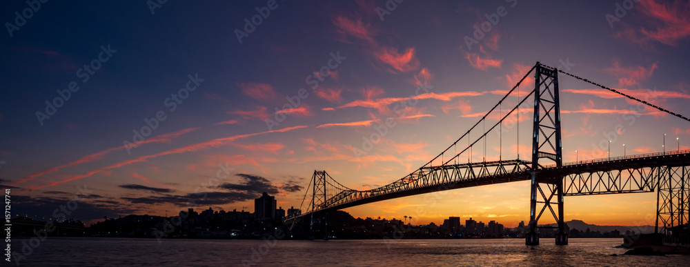 panoramic view of the sunset with the multicolored sky and the Hercilio Luz bridge postcard of the city of Florianópolis capital of the State of Santa Catarina Brazil