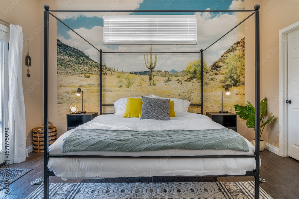 Desert-themed modern bedroom with bed, pillows, lamps, side tables