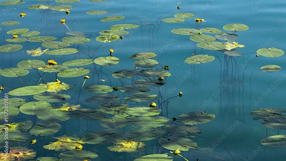 湖に浮かぶ蓮の花と葉。アルプスの瞳、ブレッド湖。