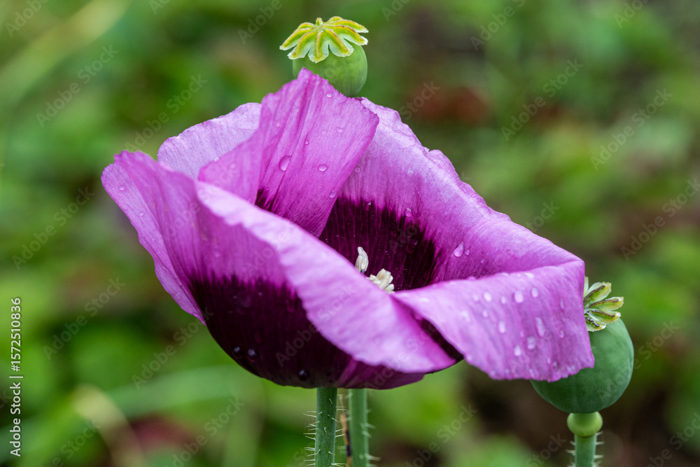 Elegant Lilac Poppy in Bloom with Water Droplets – Botanical Close-up of Flower and Seed Pod for Nature, Art, and Healing Themes