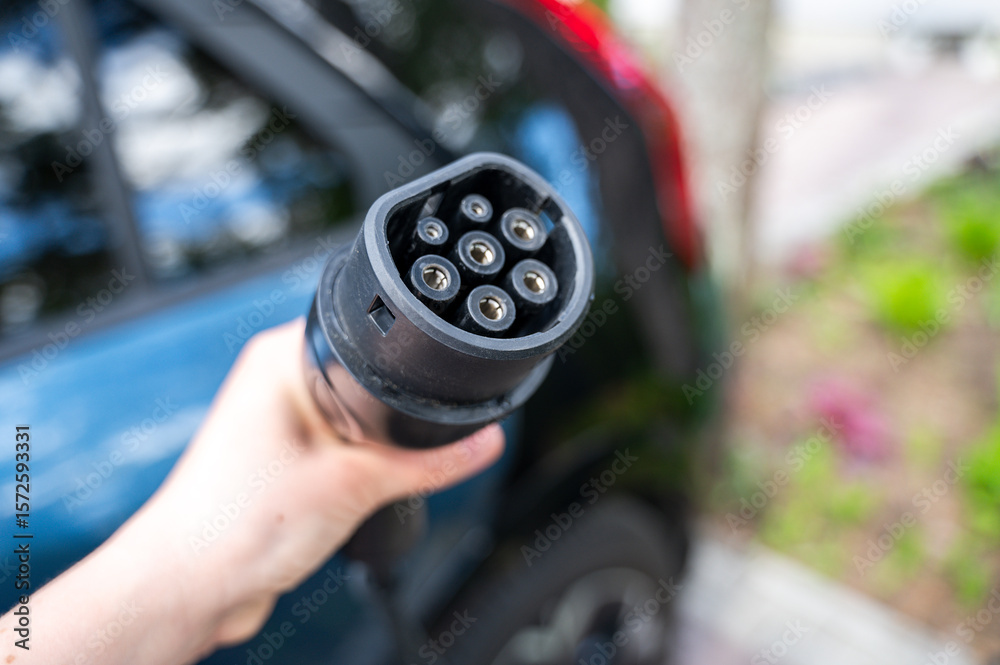 Person grips electric vehicle charger with car partially visible in background, parked in residential yard. Scene reflects shift toward sustainable mobility at home