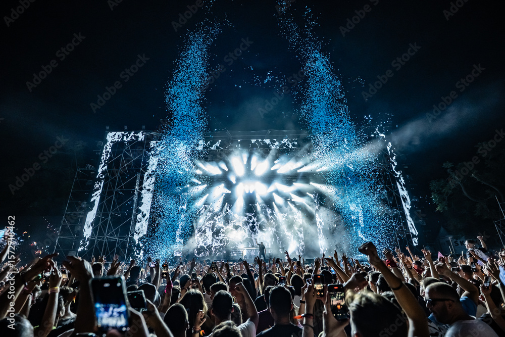 Crowd enjoying an outdoor music festival with water jets and confetti