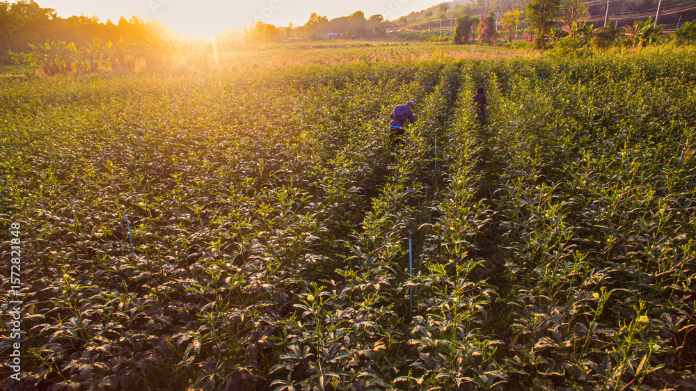 Soft sunbeams filter through the delicate petals of blooming roselle flowers and the vibrant green of okra plants. The beautifully with the glowing backlight, creating a harmonious balance of color