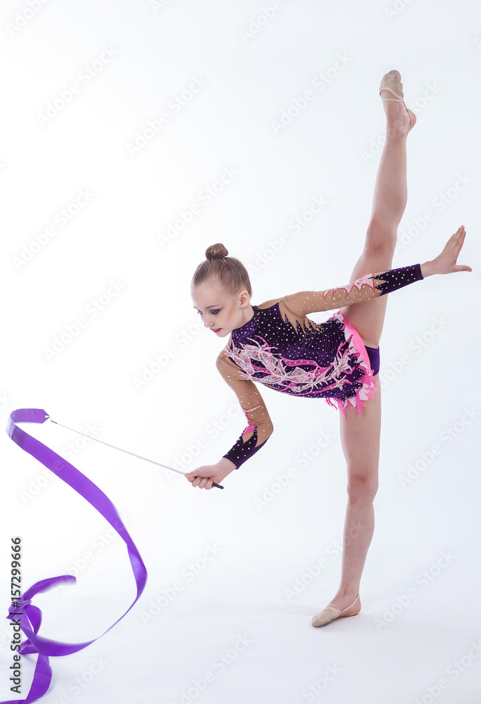 beautiful caucasian girl gymnast with Purple ribbon