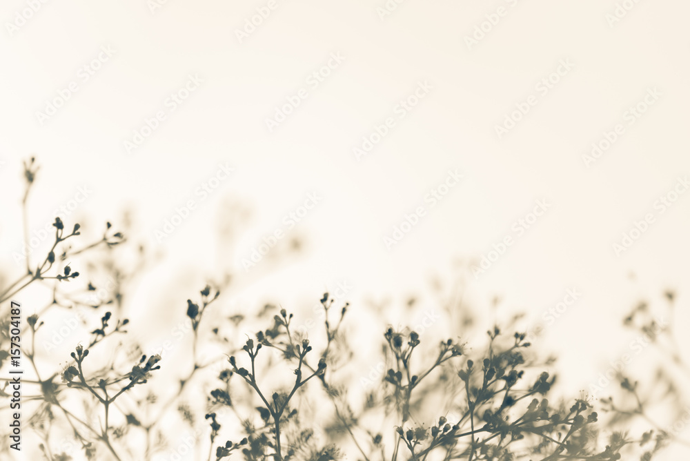 Nature white background with vague fragile twigs with small buds and flowers. Space for logo or copyright