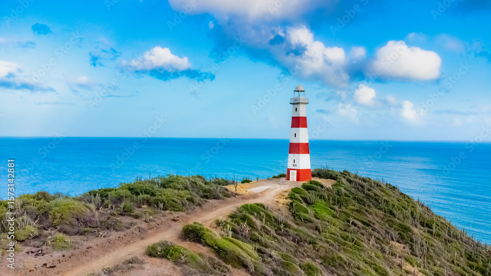 Red and white lighthouse is on a rocky cliff overlooking the ocean