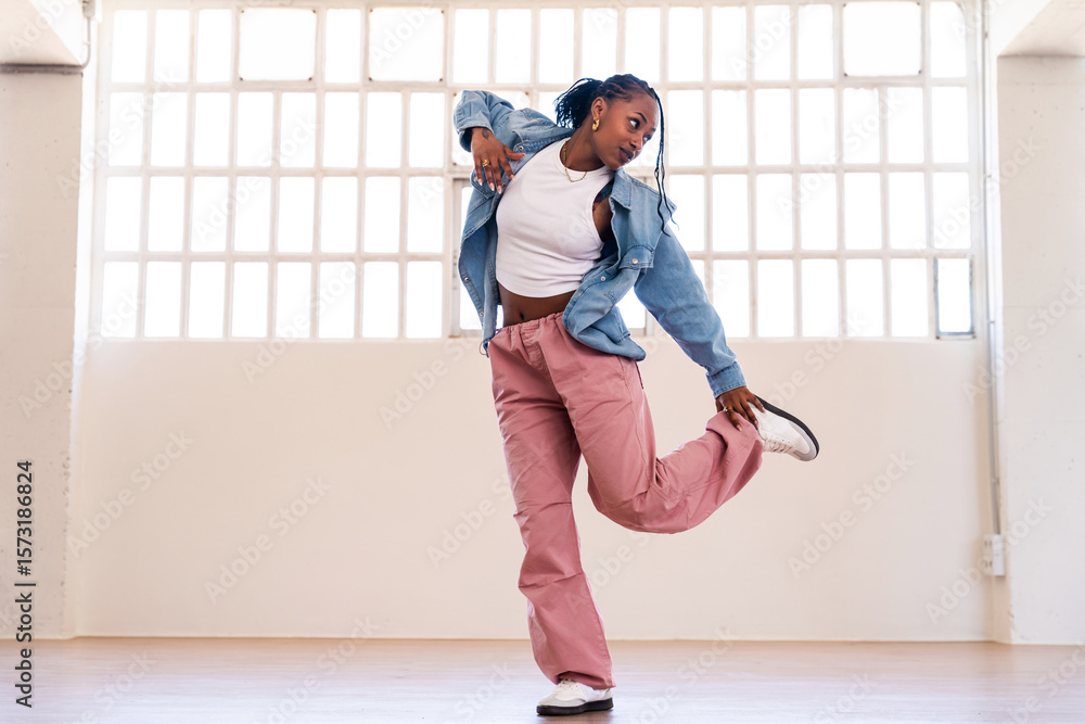 Hip-hop female dancer wearing colorful urban streetwear dancing