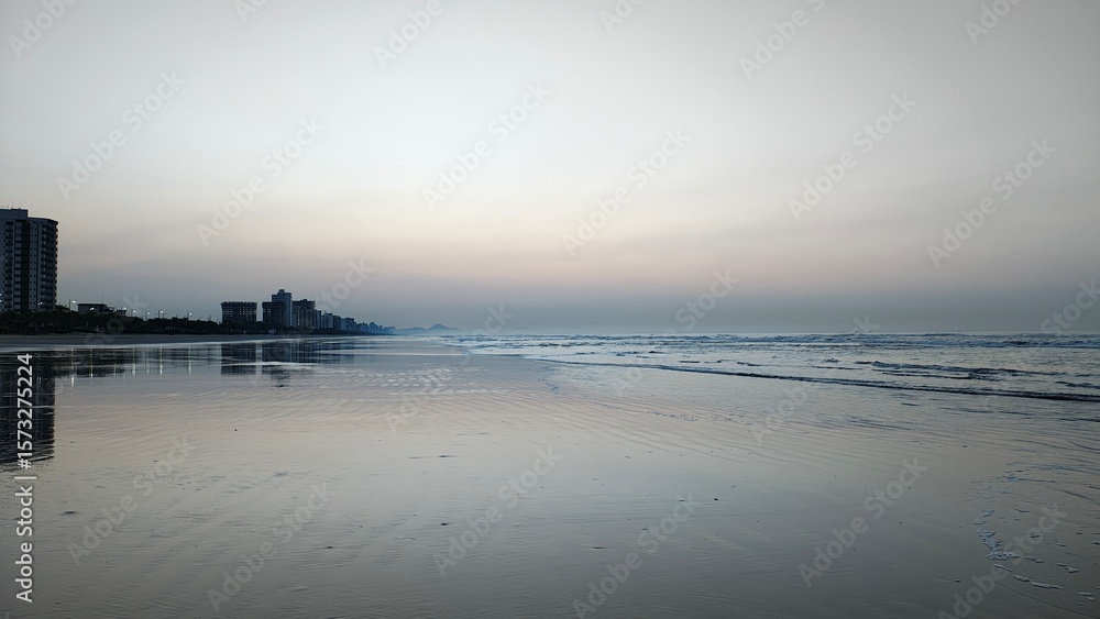 Nascer do sol dourado na Praia Grande, SP. Silhuetas urbanas refletidas na orla calma sob luz matinal. Ideal para temas de viagem e natureza urbana.