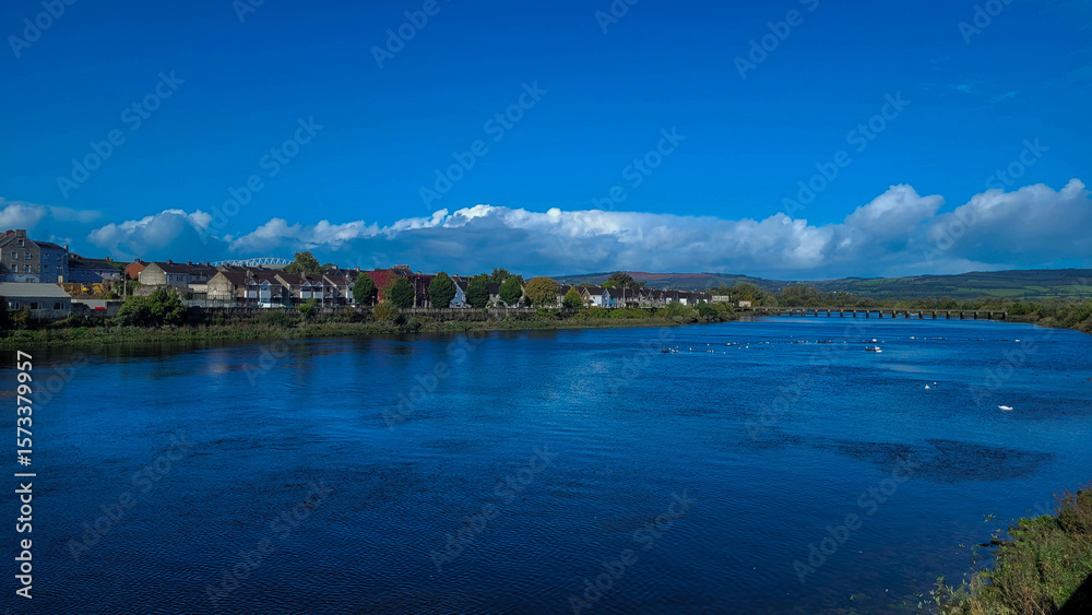 Wide View of River Shannon and Colorful Limerick Skyline on Sunny Day