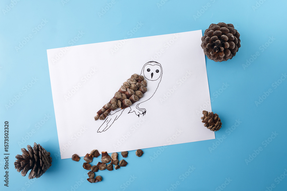 Owl drawing with pine cone scales forming wing on white paper. Studio craft photography on blue background. Autumn nature and DIY education concept. Design for postcard. Flat lay