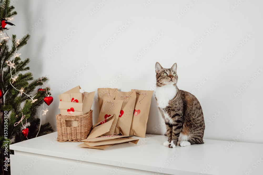 Adorable tabby cat near advent calendar bags for christmas. winter holidays traditions