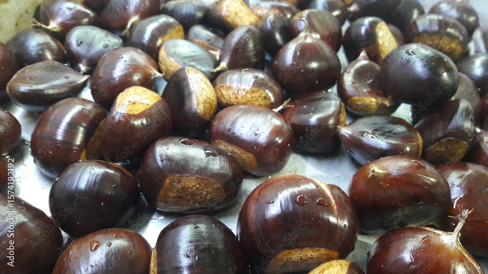 Freshly washed and scored chestnuts are displayed on a tray, ready to be roasted.