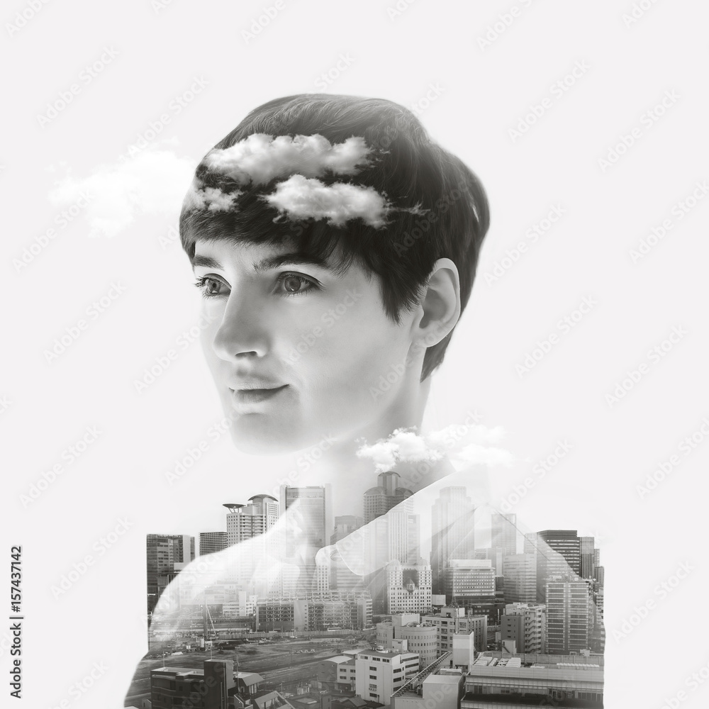 Double exposure concept with business woman, Portrait of attractive woman with the city on the background