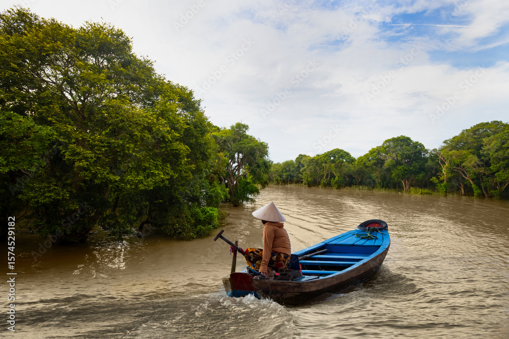 Tonle Sap lake, Siem reap Province, Cambodia. Fisherman in his boat, Floating village of Kompong Phluk, Cambodia.