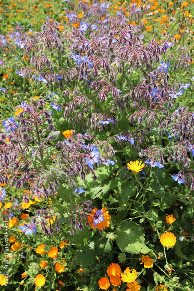 Wild Meadow of Borage (Borago officinalis) and Calendula (Calendula officinalis) in Segesta, Sicily, Italy