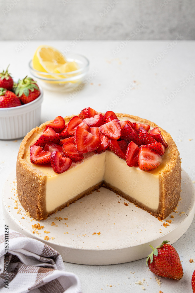 Sliced classic cheesecake with strawberries on light background. New York, Sicilian homemade cheesecake. Selective focus.