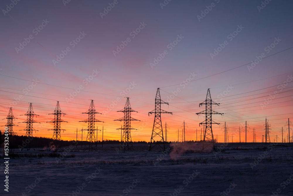 silhouettes of power lines, the theme of ecology. silhouettes on the sunset sky. Power pylons.