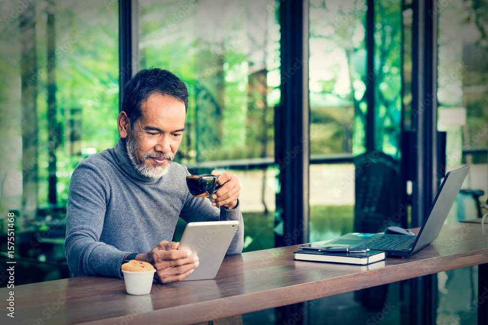 Portrait Smiling Attractive mature man with white stylish short beard using smartphone. Serving internet via his gadget. Old man using social network technology