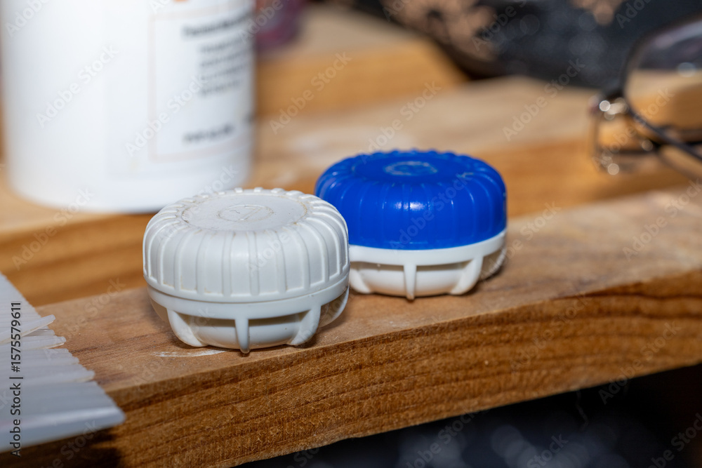Estuche pequeño para guardar lentes de contacto sobre mesa de madera. / Small case for storing contact lenses on wooden table.