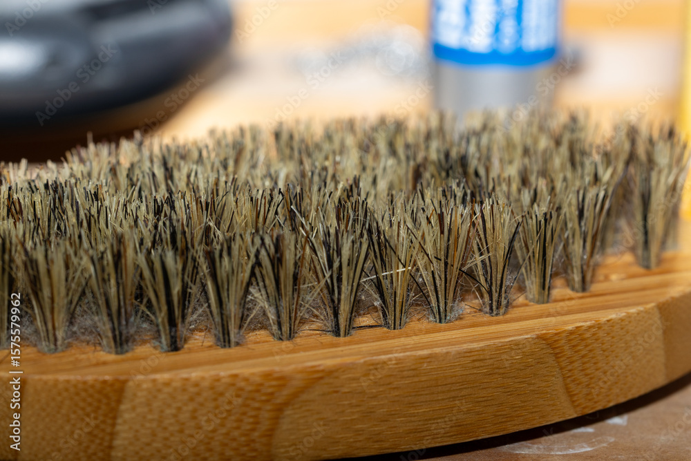Cepillo de limpieza con cerdas marrones y base de madera natural. / Cleaning brush with brown bristles and wooden base.